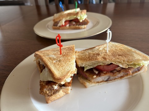 朝からカツを揚げてカツサンドの朝食にしました。カツ、オニオンスライス、トマト、レタス。家人は朝からガッツリ食べましたが私は1切れで満腹です。···