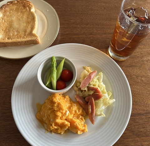 朝食はトースト、スクランブル・エッグ、キャベツとポークウインナー炒め、アスパラとミニトマト、アイスティー私は桃アレルギーなので家人だけ桃私は···